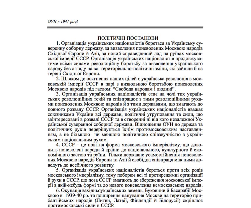Для початку наведу цитату з роботи Степана Бандери: "...Прагнення волі і правди, почуття справедливости й високий ідеалізм були і назавжди залишились основними принципами українського народу й української людини, головними кермуючими силами українського буття й української духовости. Наш народ завжди прагне волі для себе і бажає її для інших народів. Він боровся і бореться за правду і справедливість. Ми хочемо жити у згоді і взаємному шануванні з усіми народами доброї волі. Такі самі права визнаємо за іншими народами, за які боремося для себе. Не хочемо бути ні об'єктом, ні причиною поневолення та несправедливості. Ми боремося активно за волю і правду не тільки тому, що їх потребуємо для себе, але передусім тому, що Бог дав людям ці скарби і такі закони, а основою нашої волі є йти за волею Божою. Такі ідейно-моральні засади не допустять ніколи до того, щоб Україна була спільницею Москви в її протинародньому загарбницькому імперіалізмі....".