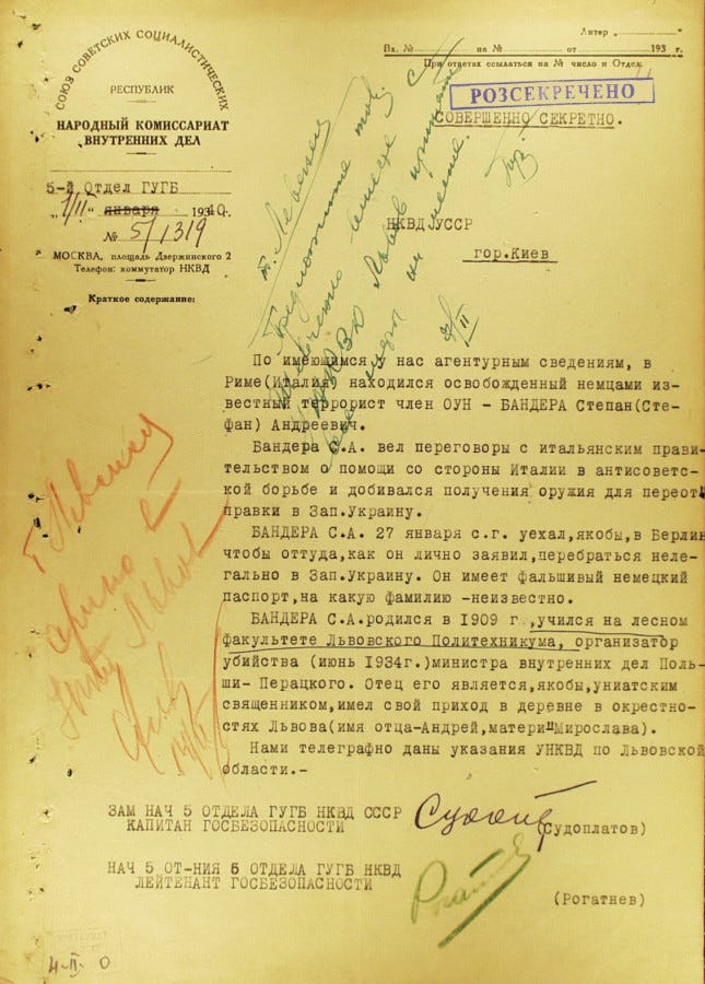 З архівів КДБ. Документи датовані 1940 та 1941 роками за Степаном Бандерою. Звертаю увагу на підпис Павла Судоплатова під документом 1940 року.